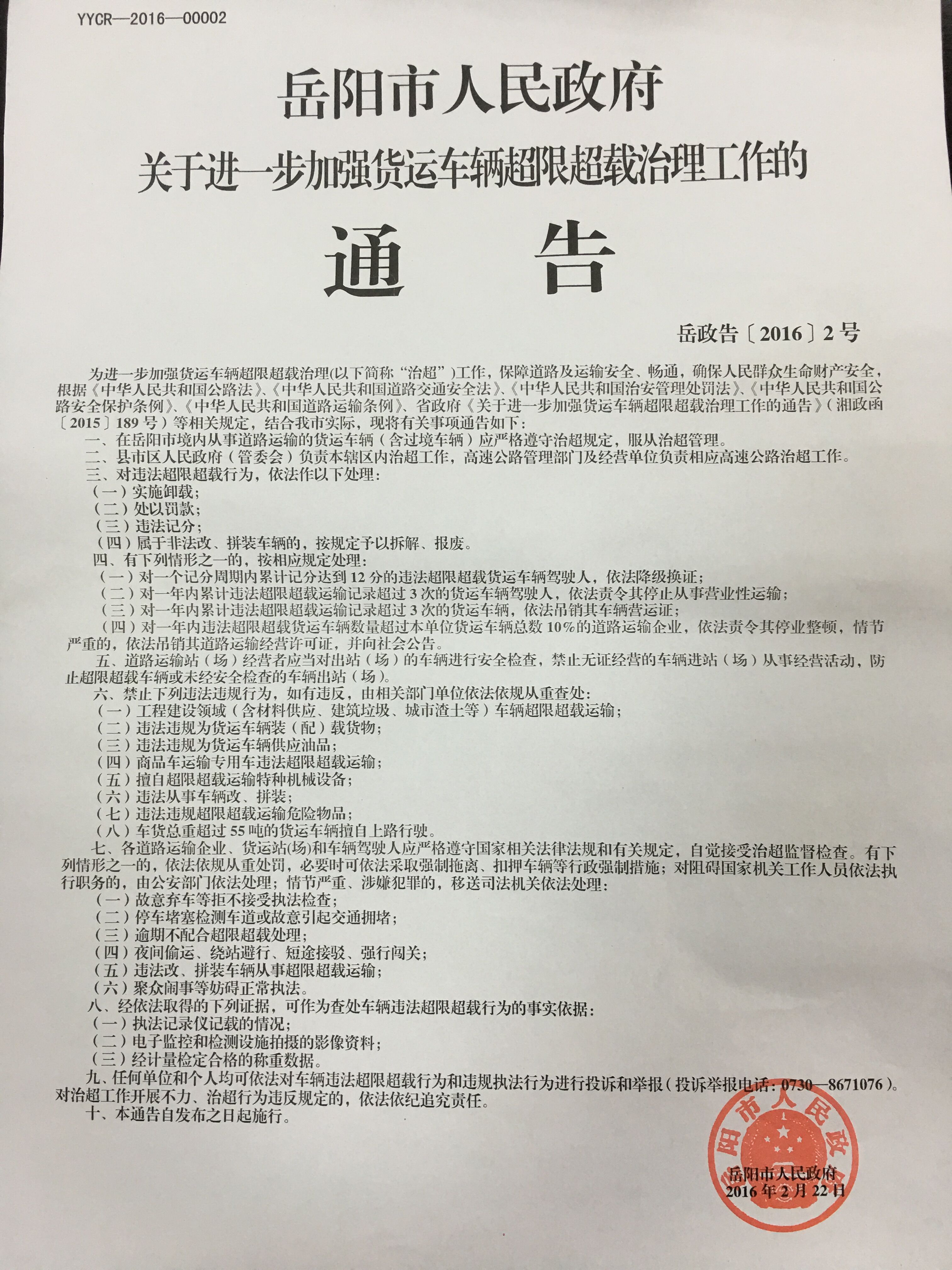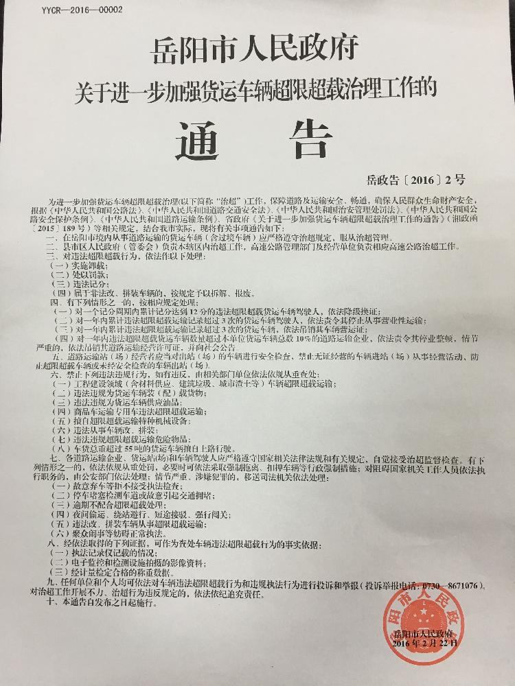 岳阳市人民政府关于进一步加强货运车辆超限超载治理工作的通告
