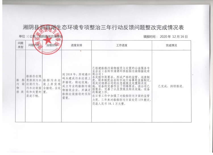 湘阴县洞庭湖生态环境专项整治反馈的“船舶存在随意排放污水垃圾行为,污水垃圾接收和处置的渠道不畅。”问题现已整改完成并纳入常态化管理。整改完成情况见附件,现拟销号,特公示。