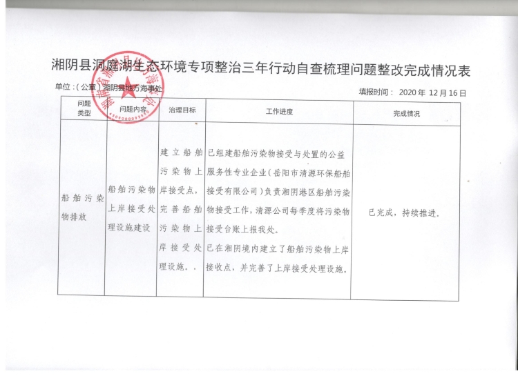 湘阴县洞庭湖生态环境专项整治自查梳理发现的“船舶污染物上岸接受处理设施建设”问题现已整改完成并纳入常态化管理。整改完成情况见附件,现拟销号,特公示。