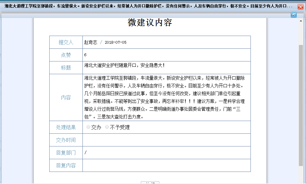 岳阳市政协委员赵奇志(189*******8)通过省政协云APP反映:湘北大道理工学院至郭镇段,车流量很大。新设安全护栏以来,经常被人为开口撤除护栏,没有任何警示,人及车辆自由穿行,极不安全。目前至少有人为开口十多处。几个月前岳阳日报已报道过此事,但至今没有任何改变,建议相关部门单位引起重视,采取措施。不能等到出了安全事故,再忘羊补牢!!!建议方案,一是科学合理增设人行过街斑马线,方便群众。二是明确街道办事处居委会管理责任,门前“三包”。三是加大查处打击力度。