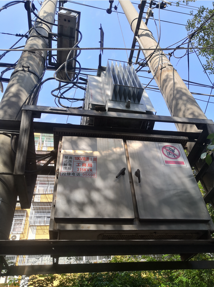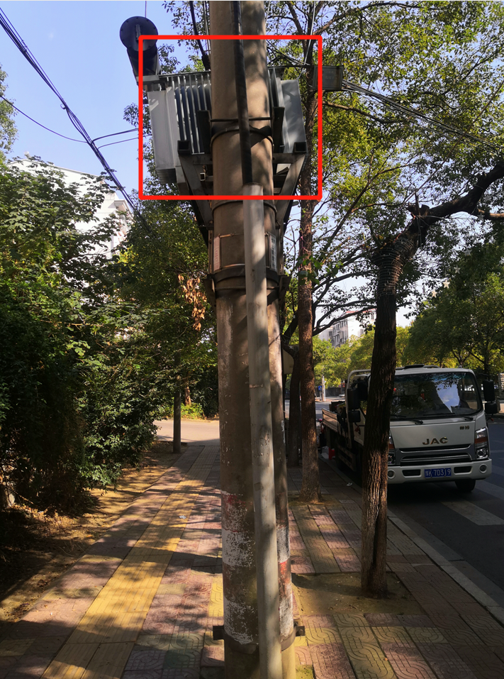 路过南湖游路,红盾小区路边,发现这个变压器倾斜了,需要注意。