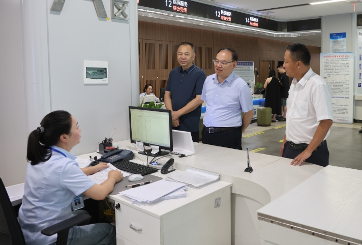 伍国用一行来到华容县团洲垸了解受灾、灾后重建、医疗物资保障等情况,并来到华容县阳光政务中心医保经办窗口调研。
