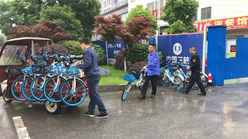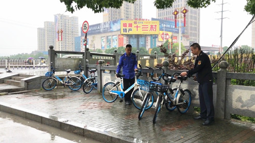 在河东中路与湘北大道交汇处,市城管局执法人员与哈啰单车工作人员正在将此处乱停乱放的共享单车摆放到指定的区域。