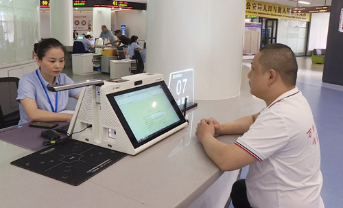 在市智慧政务中心,个体经营户冯检保刷脸取号后,到综合窗口办理营业执照变更业务,在工作人员的帮助下,5分钟就办理完了。