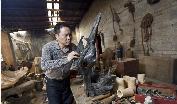 神鼎山镇苏文胜近年来浸淫于阴沉木雕刻技艺,其雕刻的“天问”屈原像在第14届全国工业美术大师作品展上获得银奖,这也是我国首件屈原乌木雕件,他本人也凭此作品被认定为省工业雕塑大师。