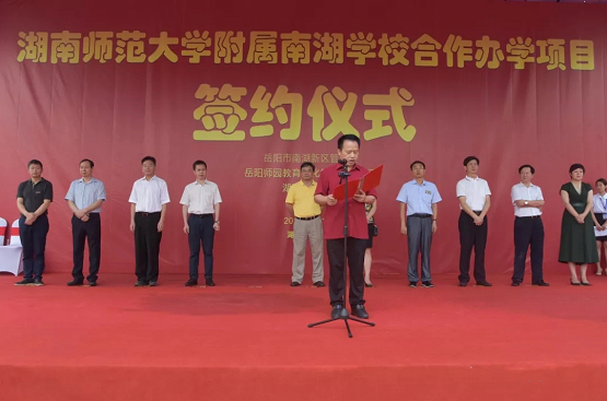 7月1日,湖南师范大学附属南湖学校合作办学项目签约仪式在南湖新区举行,岳阳市南湖新区工委副书记、管委会主任雷欣、湖南师范大学副校长王善平、岳阳师园教育文化管理有限公司董事长俞毅分别代表三方签字。岳阳市领导陈志莲、李为、方争奇及南湖新区工委书记李运帷、岳阳市教体局党组书记、局长王德华等有关部门领导出席。