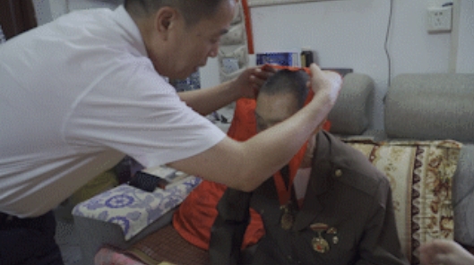 “我今年10月11日满100岁!”老党员凌南清1954年加入中国共产党,党龄67年,曾获“庆祝中华人民共和国成立70周年”纪念章。“8岁我就参加了儿童团……”回忆起当年岁月,老人依然神采奕奕。汪涛与老人交谈,询问他目前的身体状况和生活情况。“这是党中央给您颁发的‘光荣在党50年’纪念章,感谢您为党和国家作出的贡献,向您致敬!”汪涛捧出纪念章,小心地为老人佩戴上。老人戴上闪闪发光的纪念章,激动地敬了个军礼。热烈的掌声在老人的房间里久久回荡。