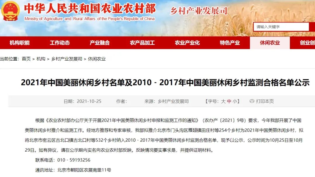10月25日,农业农村部对2021年中国美丽休闲乡村名单进行公示,全国共有254个乡村入选。