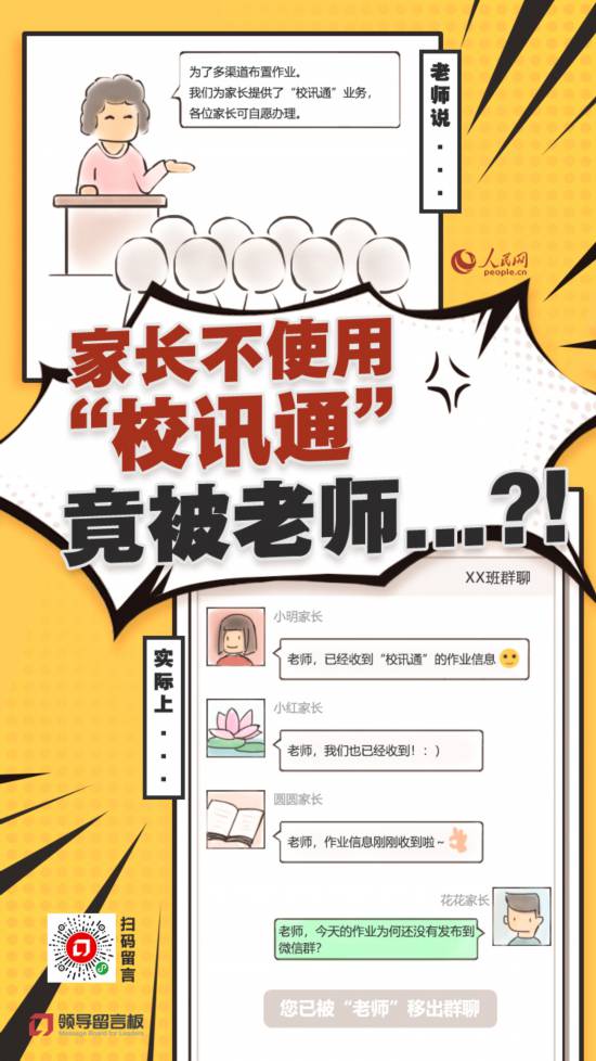 近日,安徽滁州全椒县一位网友在《领导留言板》反映:学校要求自愿办理“校讯通”,方便多渠道布置作业,可在布置作业时,老师却没有将信息发布在微信群。网友在微信群里询问,竟被老师移出了群聊。