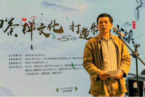 在简短的开场介绍后,马道长以一段禅意乐器尺八表演拉开了活动的序幕,沙龙活动首先由岳阳市科协党组书记陶沙岸致辞,介绍了岳阳市科协是中国创新驱动示范市的实施单位,也是全市的科技工作者之家,今年以来,以高端学术人才交流为导向,先后举办了电磁人才沙龙、新环保论坛、博士人才沙龙、巴陵青年人才沙龙等18期岳阳科创学术人才交流活动,这次作为科创茶文化沙龙的主办单位对广大领导、专家、嘉宾表示热烈欢迎。接着从传说中娥皇女英播茶籽到现代获得德国莱比锡国际博览金奖,追溯了岳阳黄茶从古至今源远流长的传奇品质和岳阳作为“中国黄茶之乡”和茶禅文化发源地的厚重文化底蕴,如今黄茶文化与南湖、茶博城、圣安寺等自然、人文景观相结合演绎了全新的茶禅文化,并表达了希望大家都像一片片茶叶一样来团结为岳阳茶业发展乃至岳阳市整体经济发展这碗茶汤奉献自己的芳香。