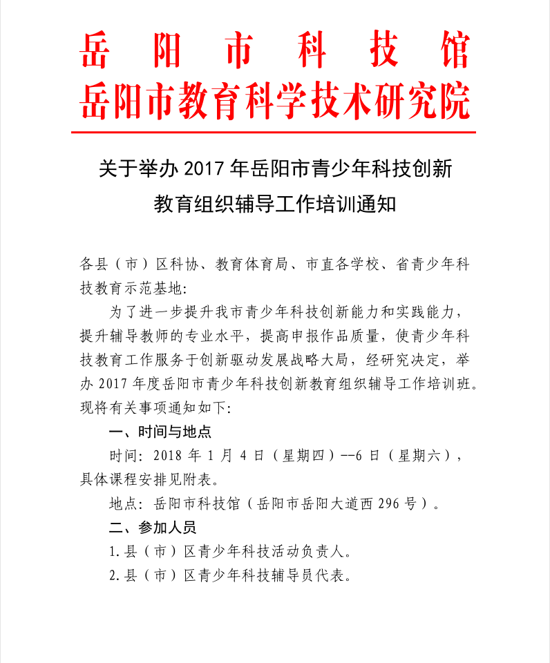 关于举办2017年岳阳市青少年科技创新教育组织辅导工作培训通知