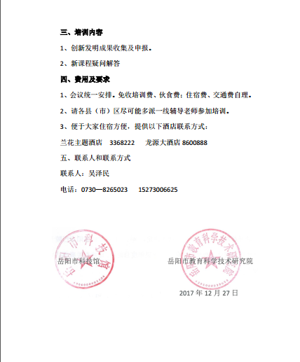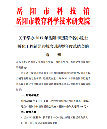 关于举办2017年岳阳市巴陵千名小院士孵化工程辅导老师培训班暨年度总结会的通知