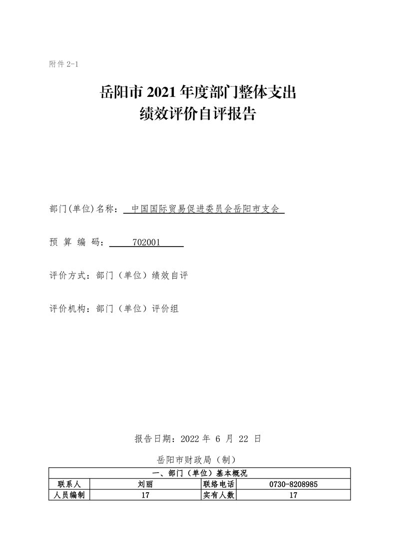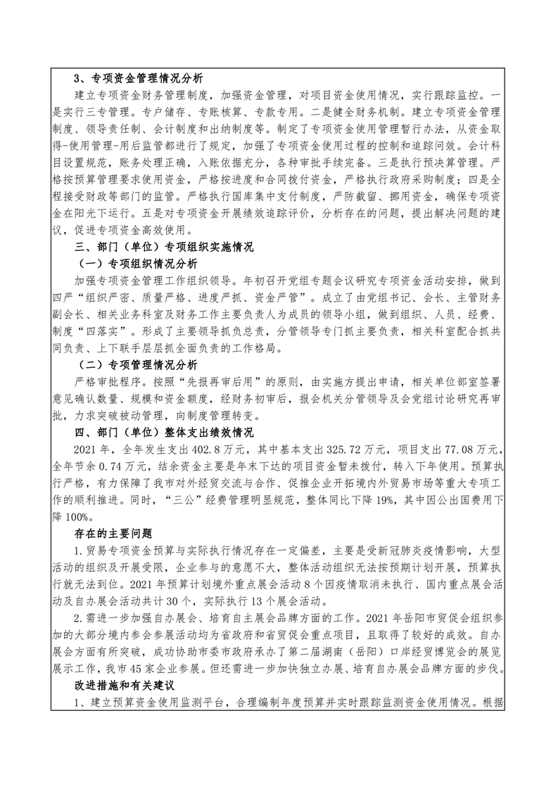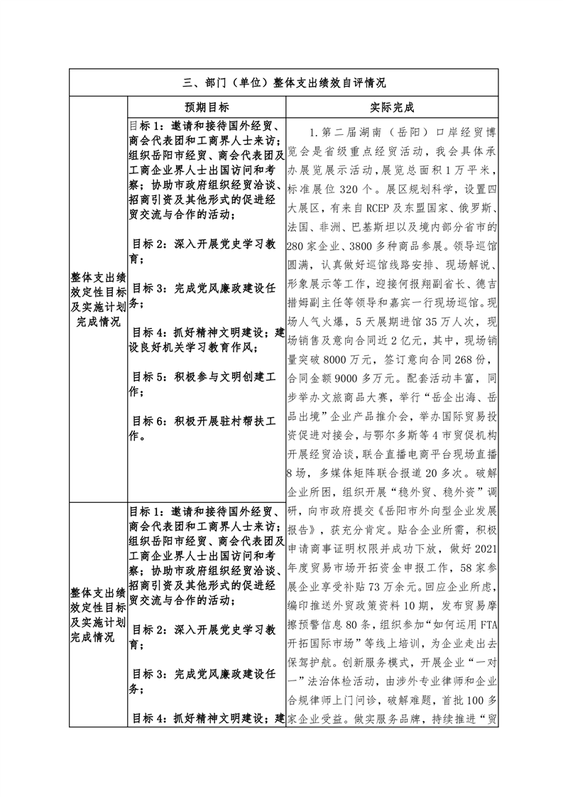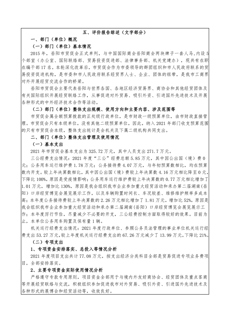 岳阳市贸促会2021年度部门整体支出绩效评价自评报告