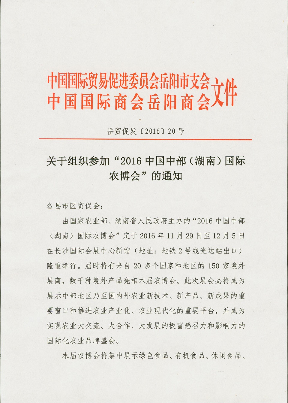 关于组织参加“2016中国中部(湖南)国际农博会”的通知
