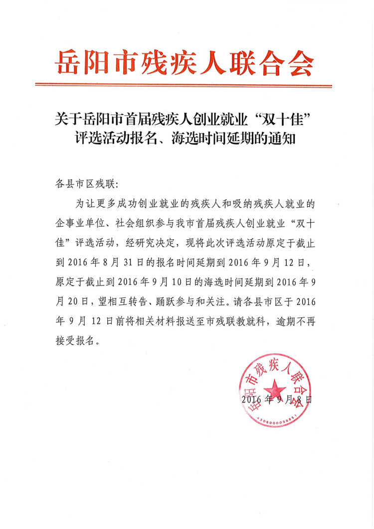 关于岳阳市首届残疾人创业就业“双十佳”评选活动报名、海选时间延期的通知