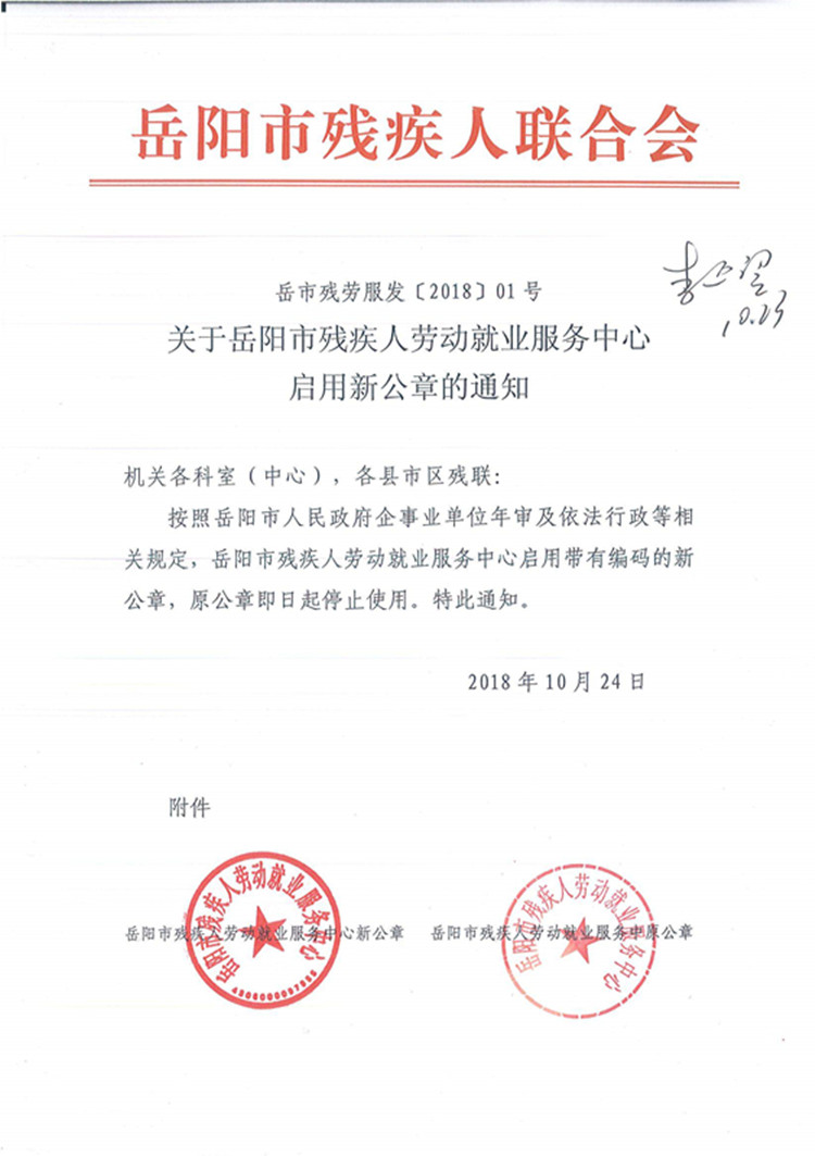 关于岳阳市残疾人劳动就业服务中心启用新公章的通知