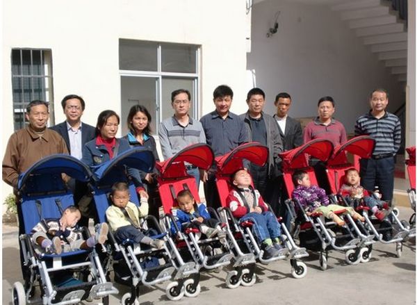 图为岳阳市残联副理事长李正望、辅具中心主任陈泽君在君山区残联免费为贫困脑瘫儿童发放轮椅
