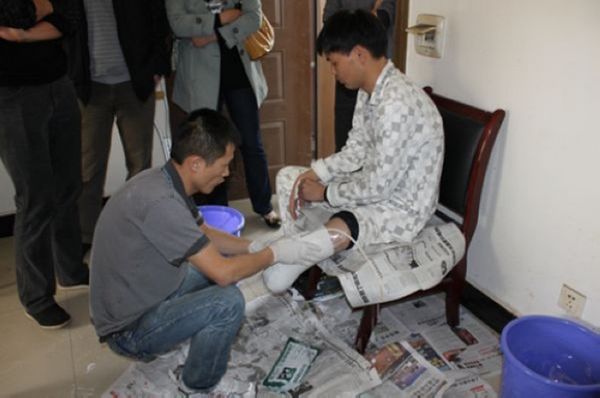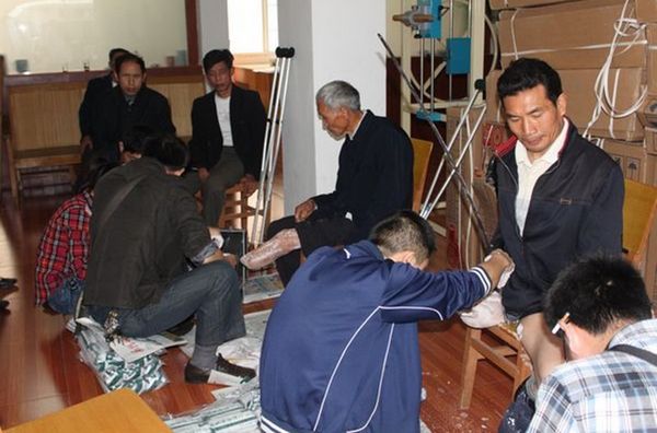 流动服务车的技师们在湘阴认真地给残疾人取型