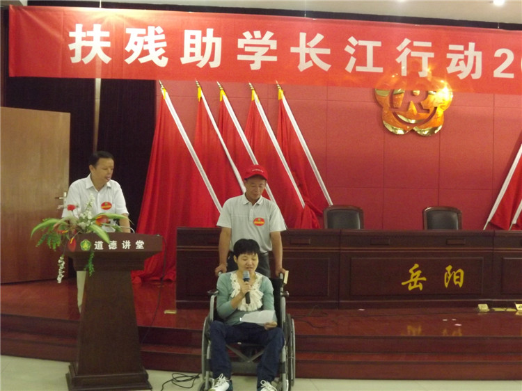 残疾人代表、岳阳经济开发区西塘镇金黄村农民周晓红发表《受助感言》。她说,我是一个离不开轮椅的重度肢体残疾人,家庭十分困难。然而,我的女儿赵灿琳却品学兼优,现在岳阳弘毅中学读初二,上学期在班里成绩名列第七名,她能歌善舞、在学校里的各项活动中都表现出色,屡屡获奖。8月11日,在湖南省第21届中小学象棋锦标赛中,第一次参赛的她就一举夺得了全省第三名的好成绩,成了这次全省中小学象棋锦标赛中的一匹“大黑马”。今天,衷心感谢爱心人士资助我女儿读书,让我的女儿和其他孩子一样也拥有美好的未来,这将温暖和鼓舞我们一家勇敢地走下去,为实现我们抗争厄运的生活目标而坚定地努力下去。