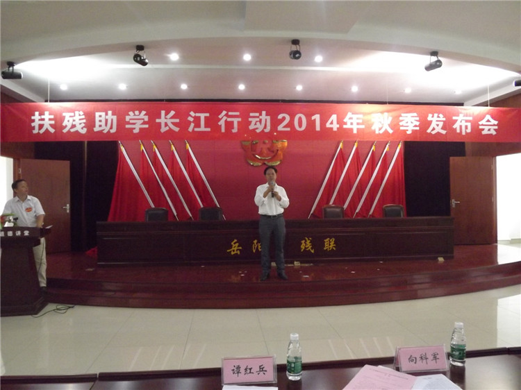 市残联党组书记、理事长向科军在致辞中说,今天,我们在这里举行“扶残助学长江行动”2014年秋季发布会,这是一次传递社会爱心的聚会,这是一次践行社会主义核心价值观的实际行动。乐善好施、扶残帮困是中华民族的传统美德,更是“先忧后乐”岳阳人民的优良传统。国武先生就是我们爱心人士的优秀代表,他已连续三年参加“扶残助学长江行动”,累计捐资近10万元,他无私奉献的精神,持之以恒的毅力,亲历亲为的作风,值得我们学习、弘扬。正是由于有国武先生、秋云先生等一批爱心人士的关心关爱,我们的受助学子完成了学业,掌握了知识技能,适应了社会需要,接受了时代选择,“知识改变命运”这句话在他们身上得到了具体、生动的验证。希望全社会以国武先生、秋云先生这样的爱心使者为榜样,贡献自己一份力量,帮助残疾人朋友筑梦、追梦、圆梦。同时,也希望广大残疾人学生和贫困残疾人家庭子女自立自强、奋勇拼搏,感恩社会,与大家携手共创文明岳阳,共享中国特色社会主义建设发展成果。