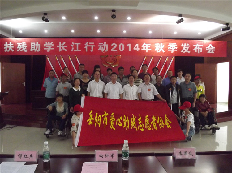 随着岳阳文明城市创建工作的持续深入,越来越多的爱心助残志愿者带着善良和热情、满怀一腔热血踊跃投身助残帮困献爱心活动。在这个波澜壮阔的大背景下,诞生于2005年8月的“岳阳市扶残助学长江行动”九年来取得了令人欣喜的成效,共募集助学金220万元,资助贫困残疾人学子和残疾人家庭子女1500多人,这项爱心助残行动已成为岳阳关注关爱弱势群体、倾情推动残疾人事业的一个“民心工程”、“品牌工程”。9月5日上午,岳阳残疾人服务中心六楼会议室里欢声笑语,扶残助学长江行动2014年秋季发布会如期举行。全国道德模范、岳阳市爱心助残志愿者协会名誉会长、湖南十三村食品有限公司董事长李国武先生,全国自强模范、中德安普成本管控集团董事长谭秋云先生的代表、中德安普岳阳分公司总经理谭红兵先生和市残联党组书记、理事长向科军及省残疾人福利基金会岳阳市分会副理事长徐震球等出席发布会。来自岳阳楼区、云溪区、君山区、屈原管理区、岳阳经济开发区和南湖风景区的24名受助残疾学生、残疾人家庭子女代表参加活动。