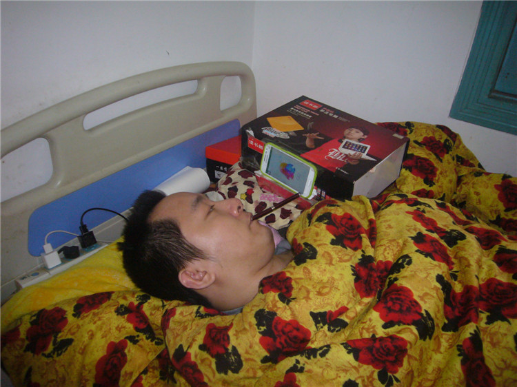 病床上的江海波坚强地用嘴巴咬住钢笔,想写出几句感谢志愿者的话