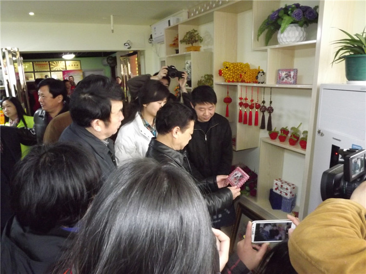盛荣华市长和徐新启部长认真听取市残联理事长向科军介绍残疾人朋友制作的手工艺品