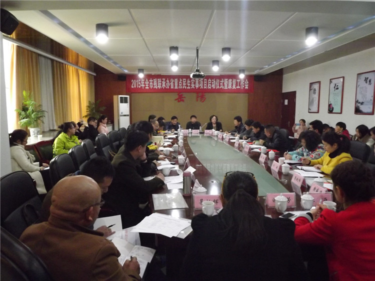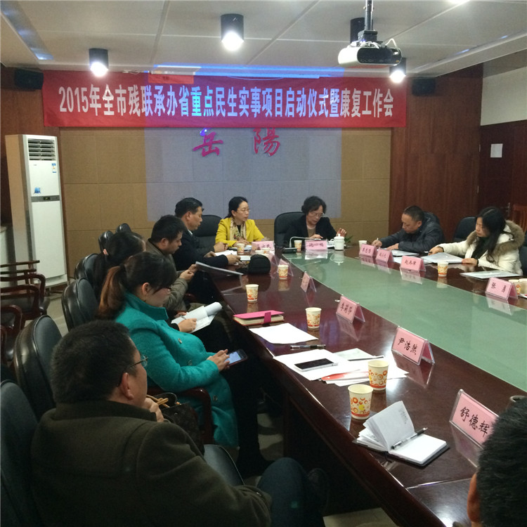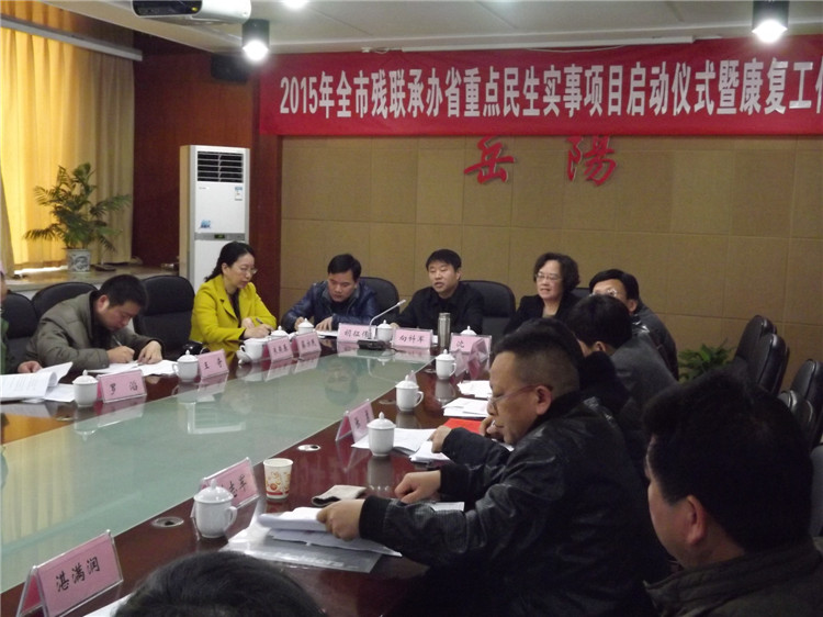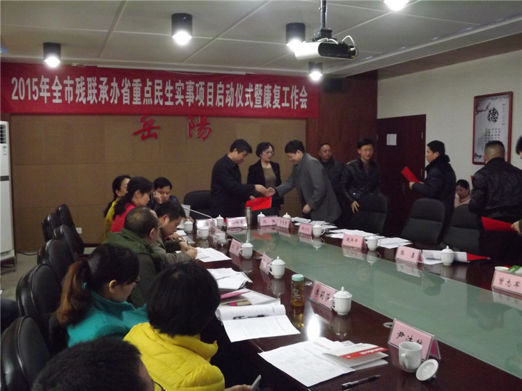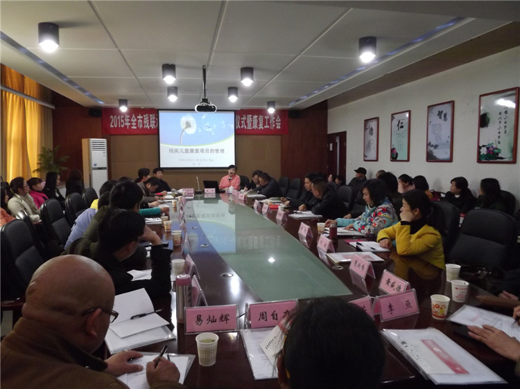 大会在热情洋溢的气氛中进行。残疾儿童定点康复机构市博康康复中心负责人朱燕春作了经验介绍,她表示,虽然博康作为民营康复机构,在过去的一年中,通过严把受助对象进入康复机构“准入”关、康复训练质量关、康复实施过程安全关,取得了服务对象的总有效率90%以上,家长培训率100%,家长满意率95%的可喜成绩。但在今后的工作中,还要下大气力打造一支更加优秀的康复技术团队、改善条件与设施、优化管理、提升服务,培养更多康复明星,为岳阳市的残疾儿童康复事业作出更大贡献。市残联康复科科长蔡亦民宣读了今年的省重点民生实事项目实施方案。各县市区残联分管副理事长向市残联向科军理事长递交了省实事项目责任状。市政府实事办领导胡征伟同志在会上赞扬市残联对承办省政府重点民生实事项目任务高度重视,行动迅速。他要求与会同志要“做好汇报、做好对接、做好服务”,争取圆满完成各项任务。市残联党组书记、理事长向科军做了重要讲话。他充分肯定了2014年全市残疾人康复工作取得的优异成绩,指出,2014年各区县残联康复工作思路清晰,落实康复政策全面,康复体系建设稳步推进,提供康复服务务实,康复工作呈现出扎实推进的局面。就如何落实好今年的省重点民生实事任务强调了三个方面的意见:一要高度重视,提高对康复实事工作重要性的认识。他指出,国家、省、市都非常重视残疾人康复工作,2015年元月,国务院出台了《关于加快推进残疾人小康进程的意见》,省委、省政府将残疾儿童康复救助项目作为15项重点民生项目之一,今年的《市政府工作报告》将促进残疾人康复事业发展等工作列为今年的重要工作任务。近年来实施康复实事项目效果明显,意义重大。二要规范实施,扎实有序推进康复实事项目。要加强领导,强化保障;分解任务,落实责任;认真筛查,规范审批;严格要求,规范施训;家庭参与,稳定效果;建立档案,做好宣传。三要加强管理,确保圆满完成康复实事任务。要健全管理机制,健全考核考评机制,加强康复机构和康复师资队伍建设,确保服务能力有效提升,加强安全管理,确保无责任事故。他号召全市各级残联和各定点康复机构精心组织,扎实工作,切实把项目做细做实,做精做优。全面完成康复工作各项指标任务,不断推动康复事业发展努力奋斗!
