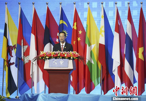 图为9月18日,第十二届中国—东盟博览会、中国—东盟商务与投资峰会在广西南宁国际会展中心开幕,中国国务院副总理张高丽致辞。 中新社发 刘关关 摄