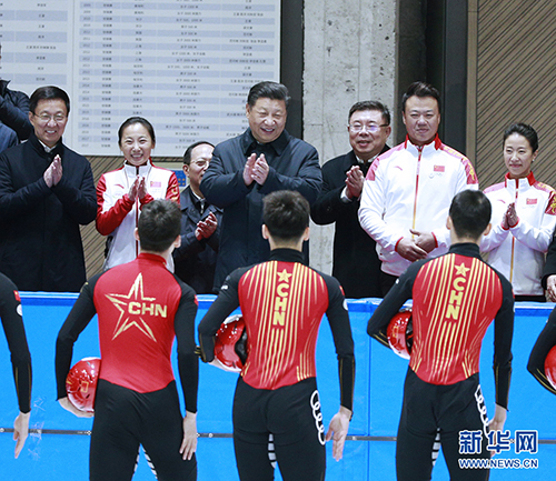 随后,习近平来到国家冬季运动训练中心,在短道速滑馆结合展板听取速滑、花滑项目介绍,之后进入馆内察看国家速滑队、花滑队训练备战情况。看到运动员们在冰面上挥洒汗水、刻苦备战,习近平表示赞许,叮嘱他们科学训练、注意安全。习近平步行前往冰壶馆,察看国家冰壶队训练备战情况。运动员、教练员看到习近平来了,争相围拢过来。习近平勉励他们注重选拔培养好人才,增强为国争光的荣誉感,坚定创造佳绩的信心,刻苦训练、全力备战、勇攀高峰,力争实现新的突破。冰壶馆前厅的沙盘,展示了首钢北区和冬奥会滑雪大跳台规划建设情况,习近平边看边问。他强调,体育强则国家强,国家强则体育强。发展体育事业不仅是实现中国梦的重要内容,还能为中华民族伟大复兴提供凝心聚气的强大精神力量。我们要弘扬中华体育精神,弘扬体育道德风尚,推动群众体育、竞技体育、体育产业协调发展,加快建设体育强国。考察结束时,习近平同运动员、教练员和工作人员代表等握手告别,现场响起热烈的掌声。