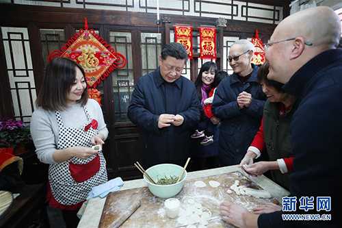 草厂胡同过去居住条件比较差,如今经过改造后,居住环境大为改善,体现了“老北京新气象,老胡同新生活”。习近平先后走进两个居民院落,了解老城区改造后居民住房条件改善情况。看到总书记到来,大家都很激动,纷纷向总书记问好。习近平仔细询问他们日子过得怎么样、冬天用什么取暖、每个月的电费要多少、年货备齐没有,祝愿他们生活幸福。居民侯雅明现场写下一副春联,给总书记拜年。习近平高兴地拿起一幅“福”字,亲自贴到门上,给这里的老街坊们拜年。习近平表示,中国共产党的追求就是让老百姓生活越来越好。在朱茂锦家,习近平同他们一家人包饺子、炸饹馇、聊家常。大家告诉总书记,这些年,老城区改造后居住条件和生活环境大为改善,大家衷心感谢共产党。习近平强调,党中央十分关心老城区和棚户区改造,就是要让大家居住更舒适、生活更美好,解决好大家关心的实际问题,让大家住在胡同里也能过上现代生活。