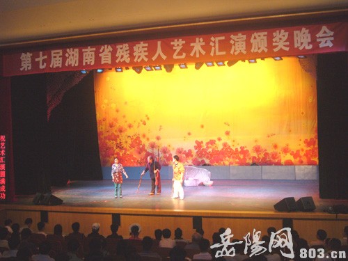 岳阳网讯:在6月25日至26日于长沙举行的“湖南省第七届残疾人文艺汇演”中,岳阳市残疾人联合会选送的节目力拔头筹,在14个市(州)、94个节目中脱颖而出,肢残人何剑雄、刘斌主演的小品《明月挂林梢》和盲人李鹏奇演奏的《三门峡畅想曲》分别夺得戏剧类和器乐类金奖,肢残人曾曦演唱的《八百里洞庭美如画》和游舰演唱的原创歌曲《选择坚强》分别夺得声乐类两个银奖,其中有3个节目将代表湖南省进京向建国六十周年献礼。鉴于岳阳市残疾人文艺工作的突出成绩,省人大常委会副主任谢勇等湖南省人民政府残疾人工作委员会领导还为岳阳市残联颁发了“湖南省残疾人文艺人才输送奖”和“湖南省第七届残疾人文艺汇演组织奖”。