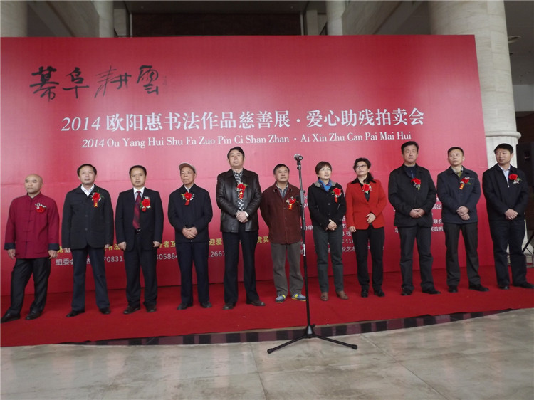 11月18日上午10时,岳阳文化艺术会展中心,“幕阜耕云?2014欧阳惠书法作品慈善展”隆重开幕。省文联名誉主席彭见明,市委常委、宣传部长徐新启,市人大副主任陈志莲,市政府副市长李为,市政协副主席刘晓英、罗陆平,湖南理工学院院长余三定,市文联主席周迅,市文广新局局长黄建文,市残联理事长向科军,省残疾人福利基金会岳阳市分会副理事长巢向阳,和省市书画艺术界专家、学者黄甲喜、黄国芳、王石生、李辉模、崔向军、戴剑等,和平江县政协、县文联等负责人及社会各界人士,岳阳市爱心助残志愿者等约500人参加开幕式。市委宣传部副部长彭东明主持开幕式。