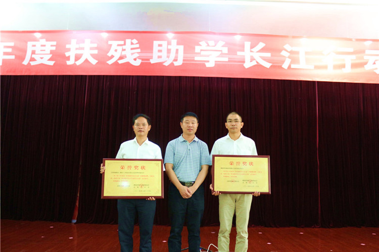 向科军理事长为李国武先生和危李先生颁发了“扶残助学长江行动爱心大使”荣誉奖牌