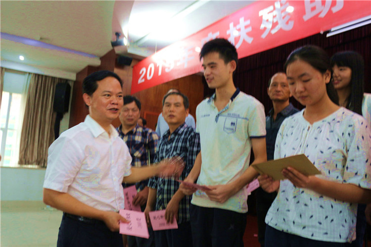 全国道德模范、中国五星级助残志愿者、岳阳市爱心助残志愿者协会会长、湖南十三村食品有限公司总经理李国武先生为贫困学子颁发了助学金