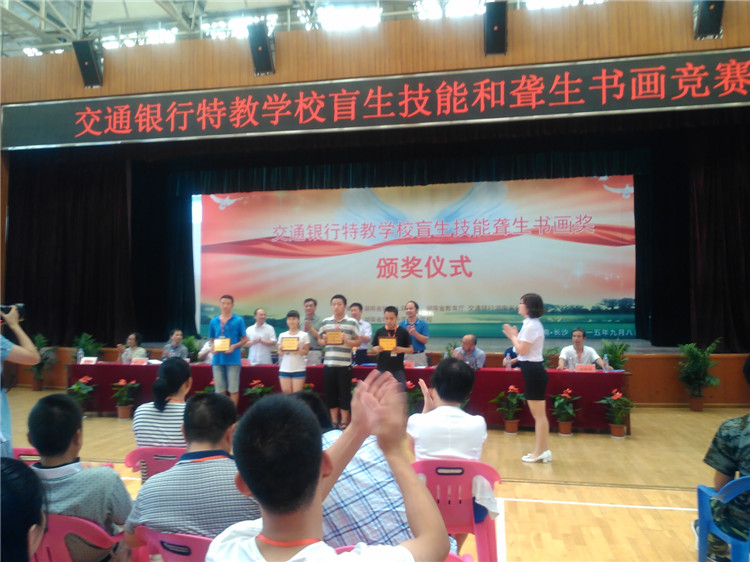 为丰富残疾学生课余生活,提升综合素质,弘扬自强不息的励志精神,在中国残联的指导和交通银行的支持下,由省残联、省教育厅、交通银行湖南省分行主办,省特教中等专业学校承办开展了“交通银行特教学校盲生技能奖和聋生书画奖”评选活动。 9月8日上午,“交通银行特教学校盲生技能奖和聋生书画奖”现场展示赛及颁奖活动在省特教中专举行。中国残联金钥匙视障教育研究中心主任、中国盲文出版社公益文化部主任冀鸿,交通银行湖南省分行副行长陈吉辉,省残联副理事长谭奇元以及省教育厅有关处室负责同志现场观摩比赛并出席颁奖仪式。