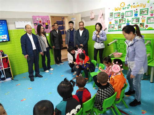 图为刘利文书记、李建军理事长调研特殊儿童康教中心课堂详细了解教学情况