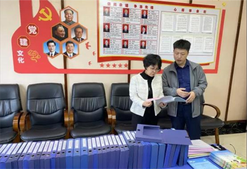 图为李建军理事长查阅特殊儿童康教中心管理资料及康复档案