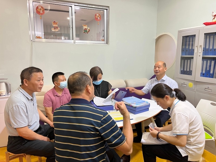图为市残联一行查看康复机构消防设施设备台账,消防知识演练方案