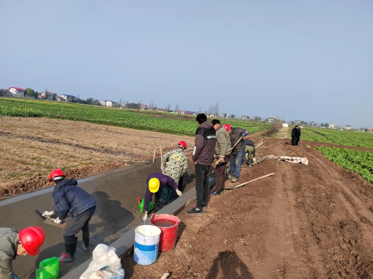 2月27日,华容县禹山镇建华村石山二组高标准农田建设现场热火朝天,工人们正忙着对渠道倒模浇筑,平整缝隙,现场围观施工的村民们兴高采烈。