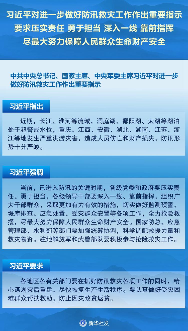 习近平强调,当前,已进入防汛的关键时期,各级党委和政府要压实责任、勇于担当,各级领导干部要深入一线、靠前指挥,组织广大干部群众,采取更加有力有效的措施,切实做好监测预警、堤库排查、应急处置、受灾群众安置等各项工作,全力抢险救援,尽最大努力保障人民群众生命财产安全。国家防总、应急管理部、水利部等部门要加强统筹协调,科学调配救援力量和救灾物资。驻地解放军和武警部队要积极参与抢险救灾工作。