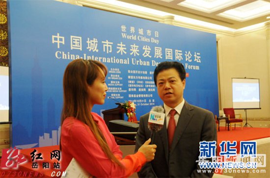 图为原岳阳市长盛荣华出席“中国城市未来发展论坛”,并接受新华网采访。