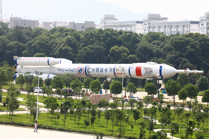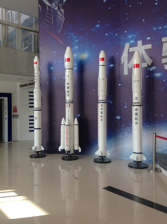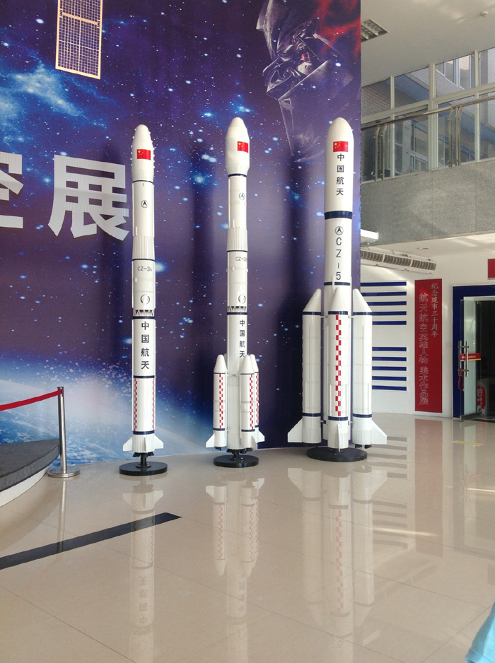 展品:全国首枚仿真原型火箭模型-“CZ-2F”(镇展之宝,我国所有运载火箭中起飞质量最大、长度最长的火箭。神十上天时用的运载火箭就是它。)