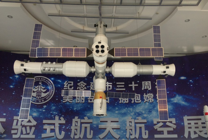 展品:未来空间站模型(由五个模块组成。它包括一个核心舱,两个实验舱以及货运飞船和神舟飞船。我国预计于2017年以后开展大型的,长期有人照料的空间站的建设,预计于2020年基本建成,到时将会有多名宇航员在这个空间站内长期的巡访、生活和开展各种实验)。