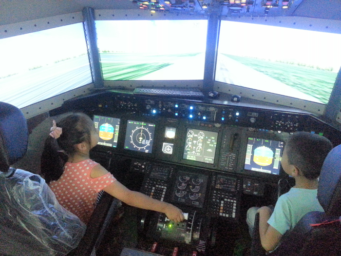 波音737模拟驾乘(在模拟驾驶舱里,体验一回当机长,推动油门,拉升操作杆,让飞机快速在岳阳民院机场跑道上起飞,穿过蓝天白云,越过山川河流,直达首都北京机场。途中还会遇到气流,您可要小心驾驶。)
