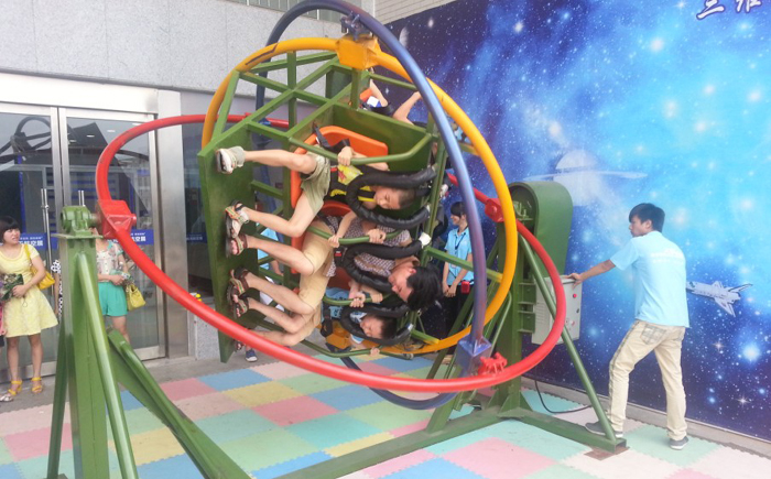 三维太空滚环(这是一个锻炼航天员的抗晕能力,并模拟失重状态的模拟器,由三层圆环构成,每个环都围绕一根轴旋转,中间的椅子能360度任意方向旋转。天旋地转之后是否还能站稳,够胆量的话快来试试吧!)