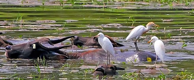 牛背鹭是目前世界上唯一不以食鱼为主而以昆虫为主食的鹭类,其与家畜,尤其是水牛形成了依附关系,在湿地中较干的地方出现,往往跟水牛在一起。常跟随在家畜后捕食被家畜从水草中惊飞的昆虫,也常在牛背上歇息,因而得了个“牛背鹭”的名字。
