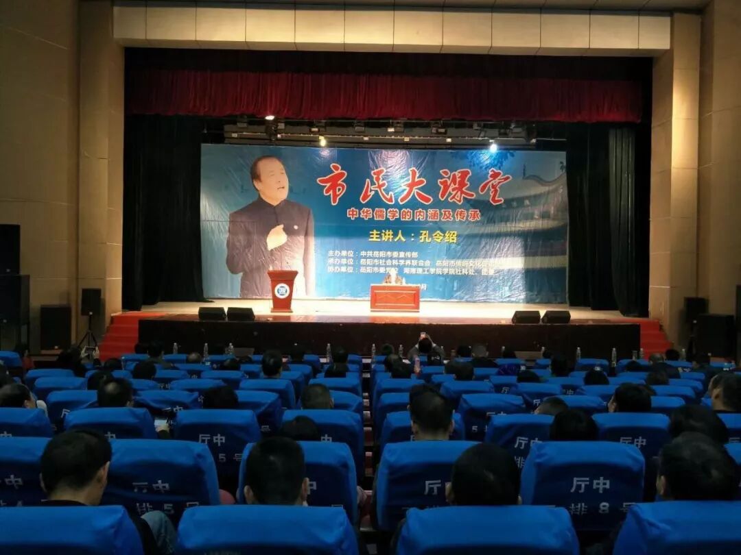 2018年10月16日上午,以“中华儒学的内涵及传承”为主题的市民大课堂在湖南理工学院举行,孔子第76代后裔,山东省中华文化促进会学术委员会委员,山东曲阜中华文化促进会主席,齐宁政德学院客座教授孔令绍结合孔子与中华文明、家风传承等内容呈现了一场令人回味无穷的文化盛宴。