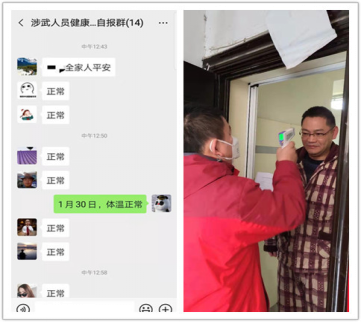 4、对集团涉武人员进行排查跟踪,涉武人员健康汇报微信群内汇报每日身体状况,及时跟踪反馈 ,办公区、厂区、生活区每天严格消毒,严控人员进出。