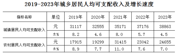 全年城乡居民人均可支配收入31257元,同比增长5.8%。按常住地分,城镇居民人均可支配收入38863元,同比增长4.5%;农村居民人均可支配收入24655元,同比增长7.0%。全年居民人均消费支出18413元,比上年增长7.2%。按常住地分,城镇居民人均消费支出18912元,增长9.9%;农村居民人均消费支出17980元,增长4.8%。